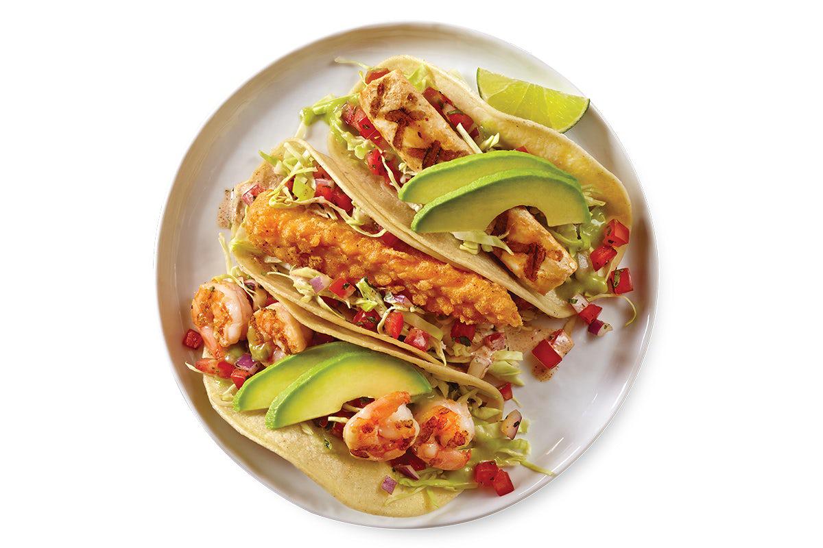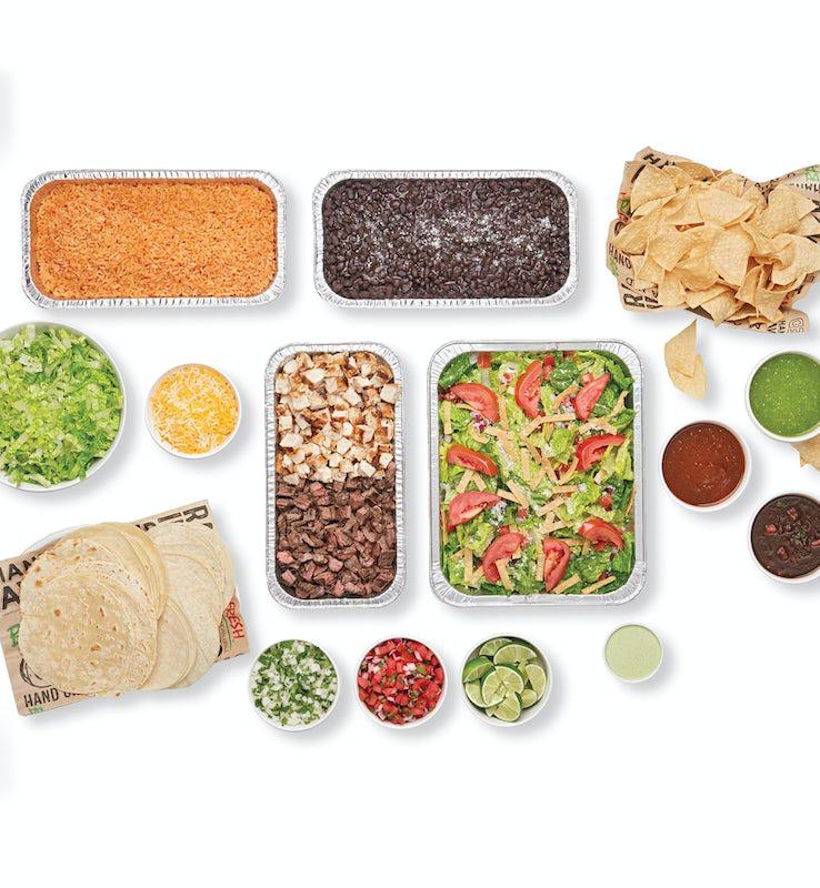 Feeds 10 | Build your own tacos with your choice of fire-grilled chicken, pork carnitas, shrimp or steak, black or pinto beans, flour or corn tortillas, and 2 of our signature salsas. Includes rice, cheese, lettuce, onion & cilantro mix, pico, salsa baja, baja ensalada® and chips.