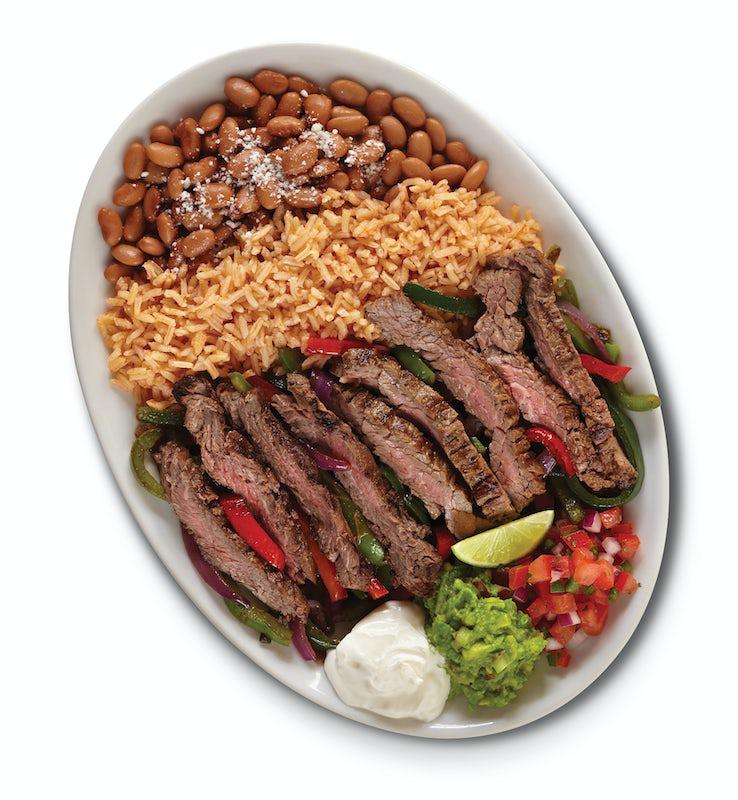 Grilled meat or seafood, roasted veggies, Baja rice, choice of black or pinto beans, sour cream, guacamole, and pico de gallo with warm corn or flour tortillas.