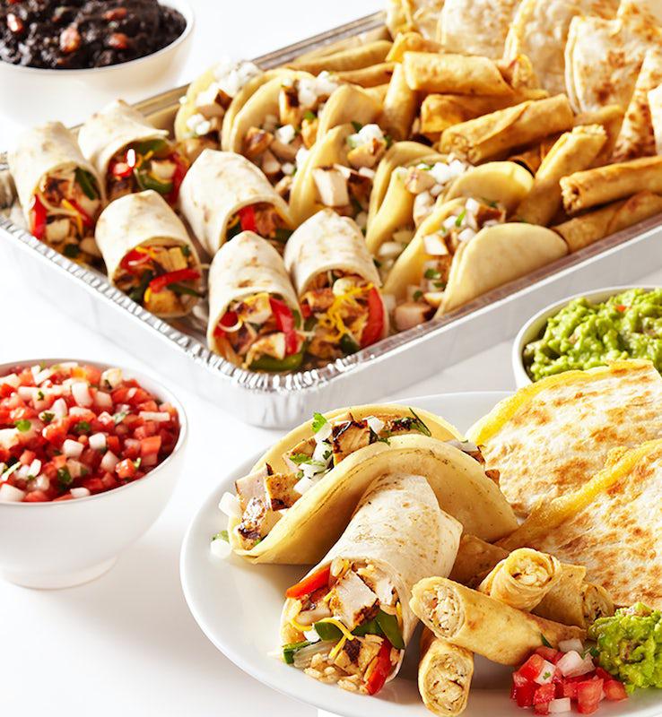 Serves 5 as a meal and up to 10 as an appetizer. | An explosion of flavors that includes 10 taquitos, 5 tacos, 3 mini burritos ultimo, 2 cheese quesadillas, guacamole, sour cream, chips and 2 signature salsas.
