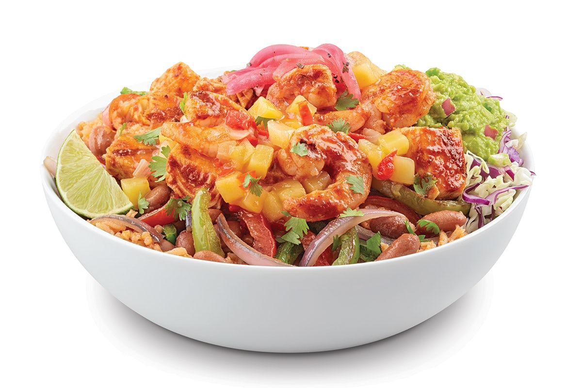 Rice, black beans, roasted tomatillo salsa, grilled shrimp, grilled wahoo, guajillo sauce, green and purple cabbage, guacamole, mango salsa, pickled onions, and cilantro.